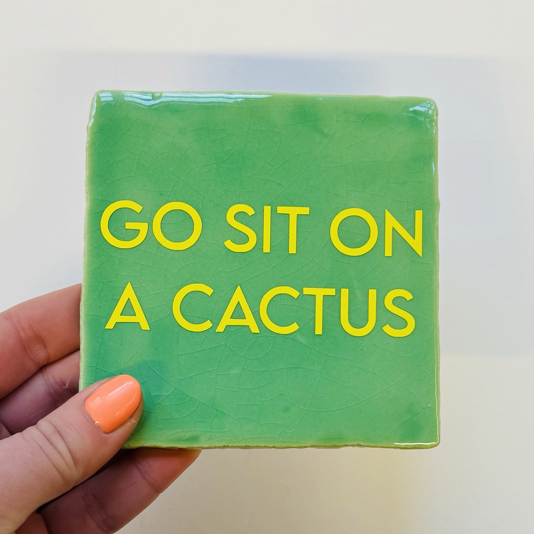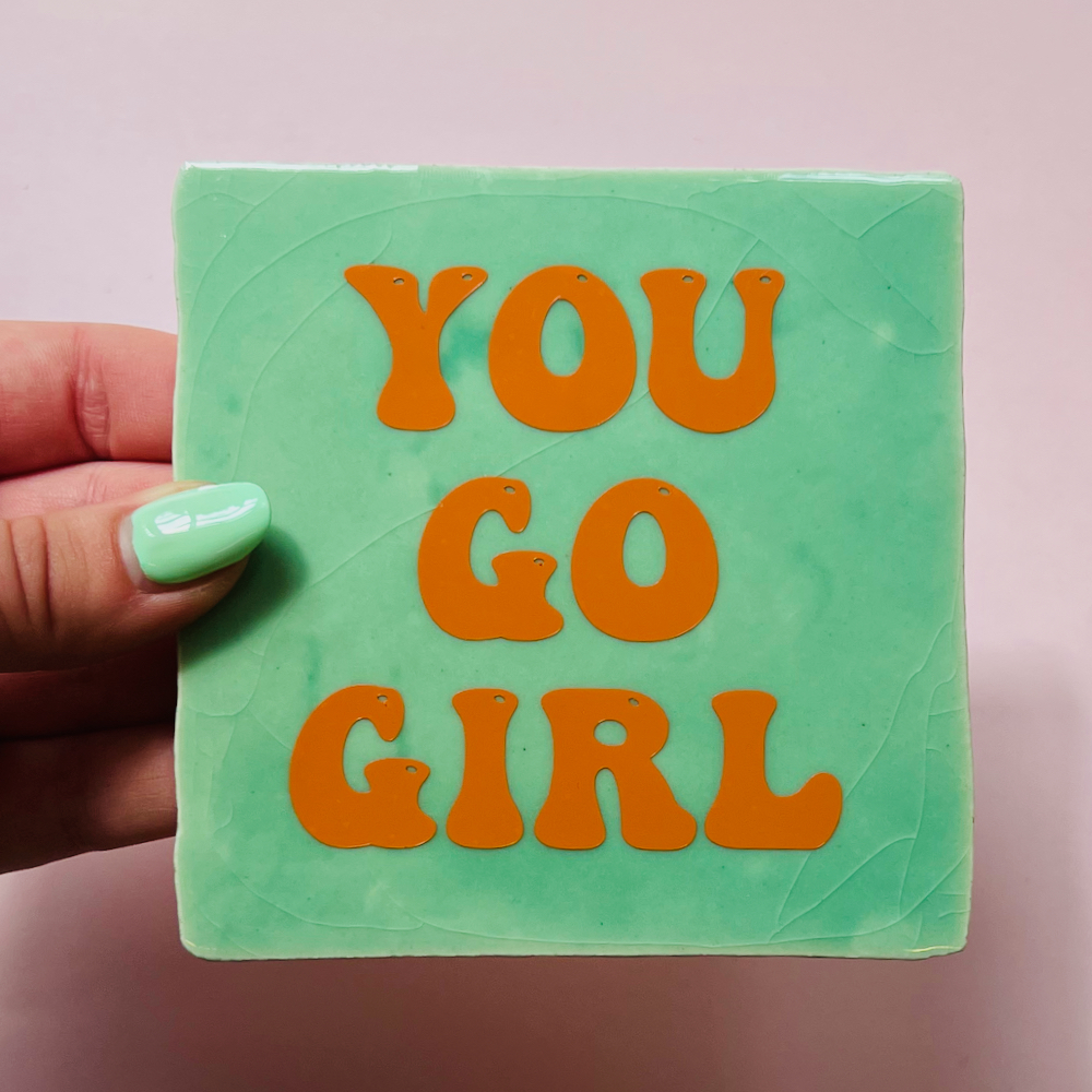 Perfect om neer te zetten in huis of bestel er een plakhaakje bij zodat je de tegel aan de muur kan hangen!